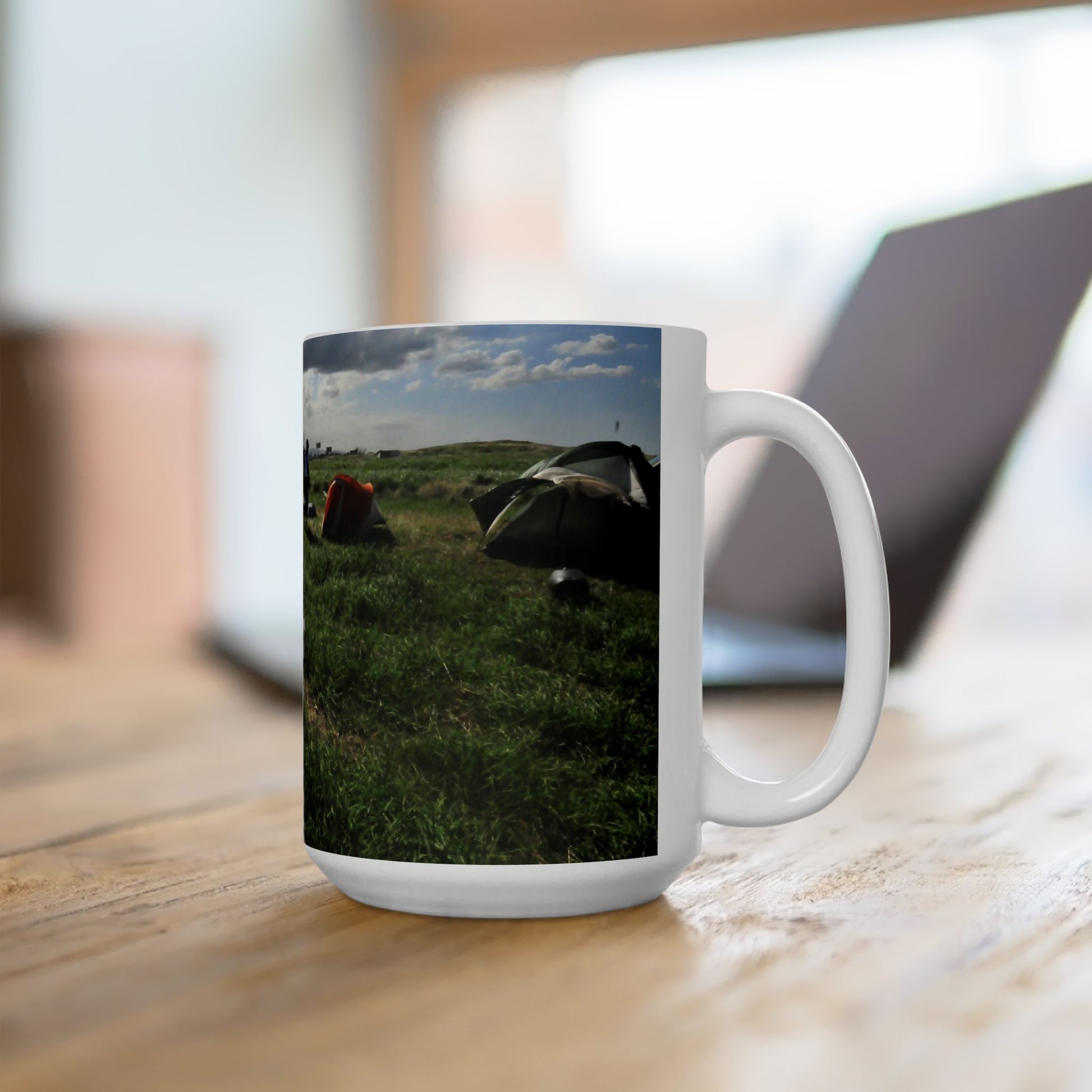 Elegant 15oz Ceramic Coffee Mug printed with beautiful image of camp tents in a open field.