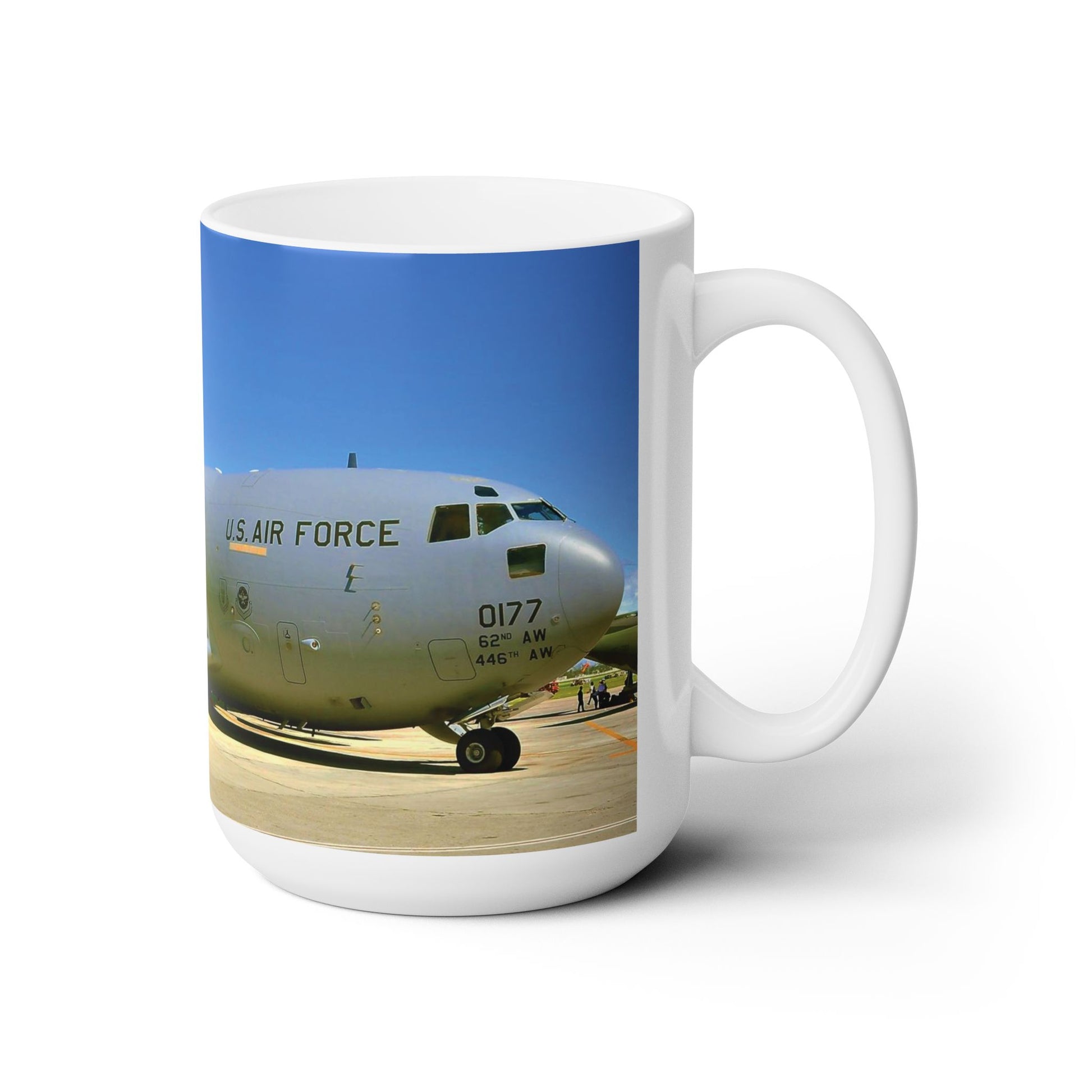 Elegant 15oz Ceramic Coffee Mug with a beautiful image of a C-5 Galaxy cargo airplane.